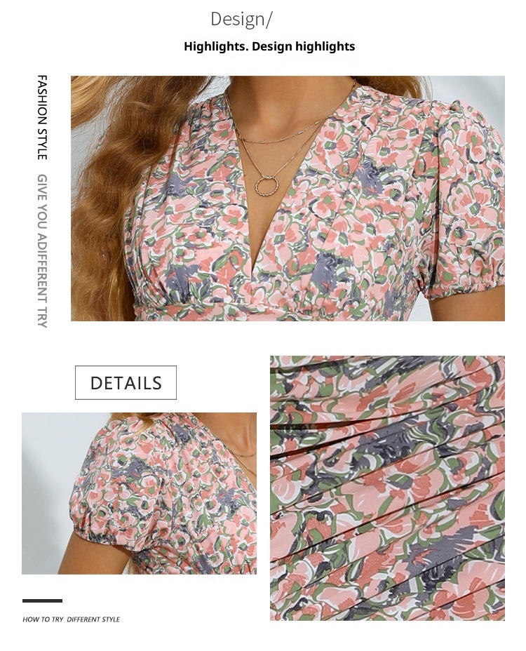 Bohemian Style Fitted Print Pleated Short Sleeve Dress