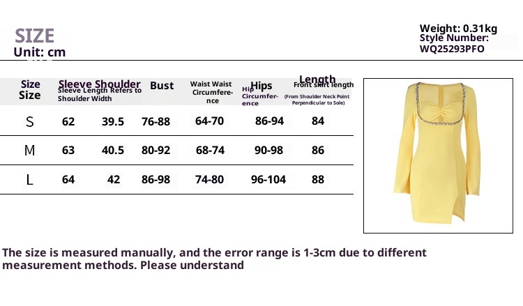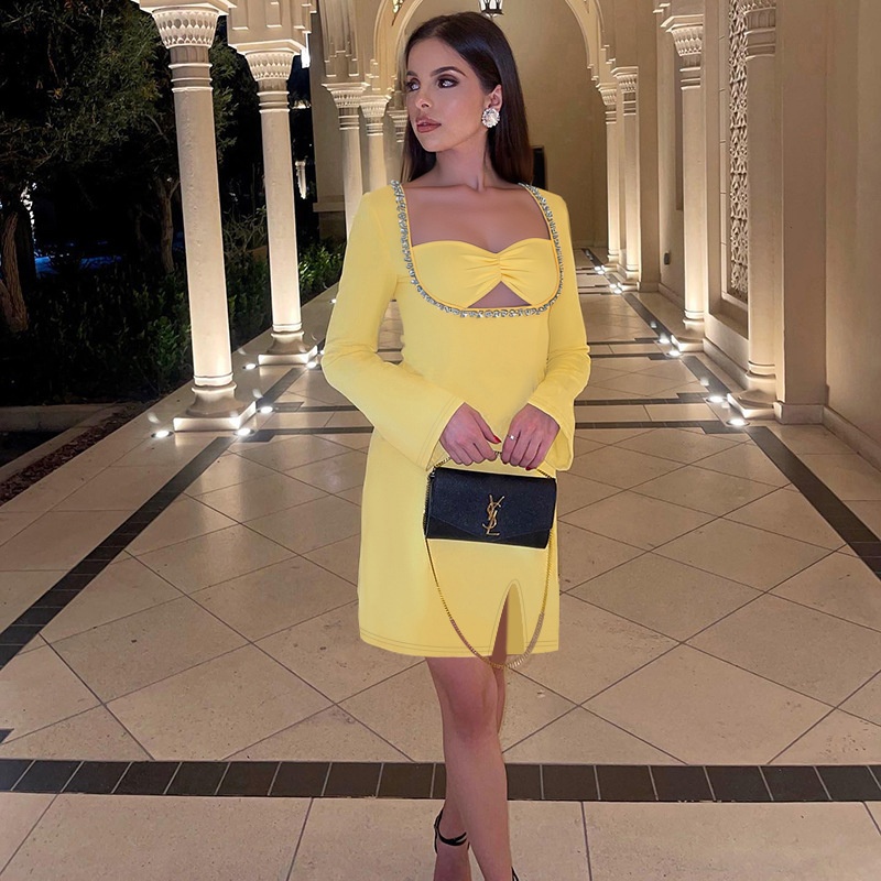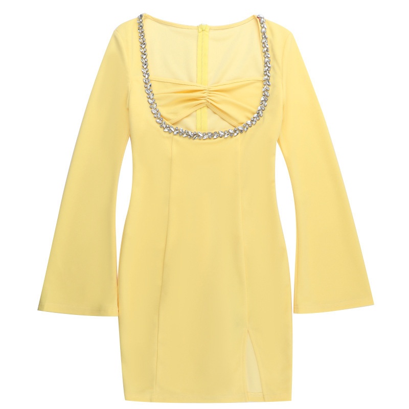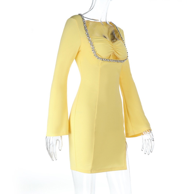 Square Necktie With Diamond Fine Glitter Sexy Slit Long Sleeve Dress