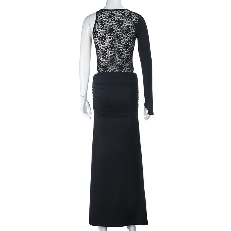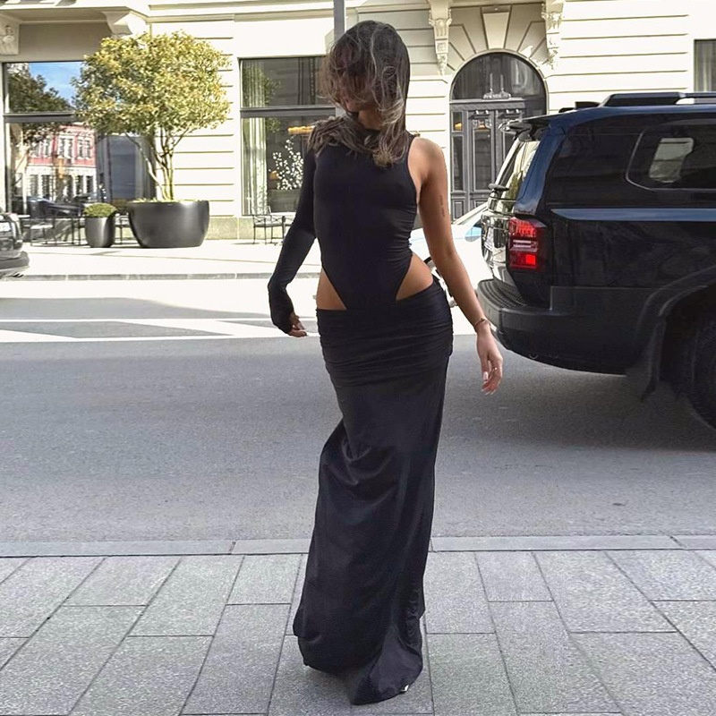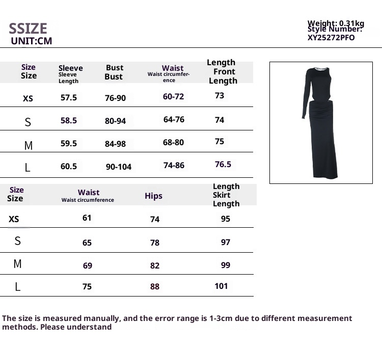 Product information: Pattern: Solid color Color: Black Size: XS, S, M, L Dress length: Long dress Popular elements: Slit Fabric name: Polyester Sleeve type: Regular sleeve Applicable gender: Female Sleeve length: Long sleeve