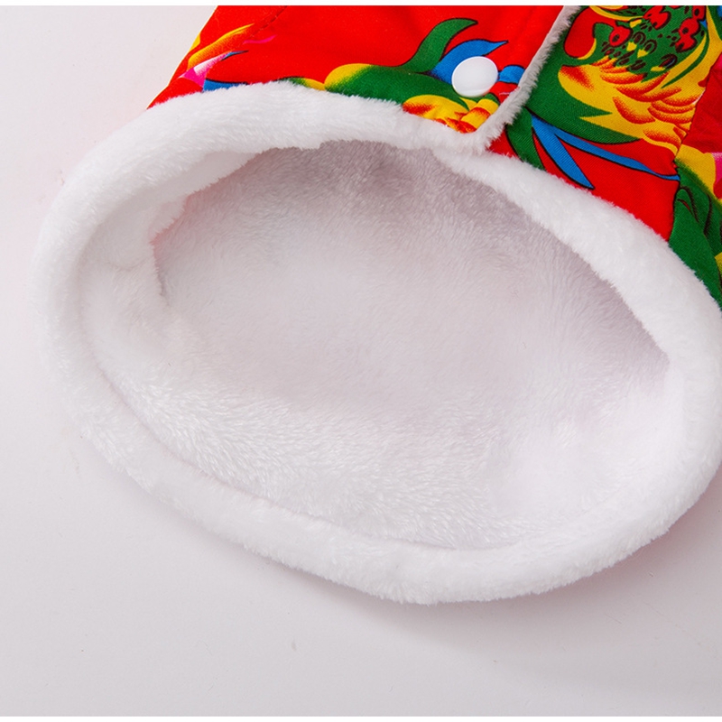 Product Description Elevate your pet's style with this Chinese Folk Style Floral Pet Coat. Featuring a vibrant red fabric decorated with large, colorful peony blossoms, it embodies traditional Chinese aesthetic charm, perfect for festive occasions or adding a unique cultural touch to daily wear. The coat is lined with soft white faux fur for exceptional warmth and comfort, ensuring your furry friend stays cozy in cooler weather. It also comes with a metal leash ring for convenient walks, combining functionality with fashion. Ideal for small to medium-sized pets, this coat is not just an outfit but a statement piece that blends cultural heritage and practical design. Let your pet shine with this eye-catching, warm, and stylish apparel!